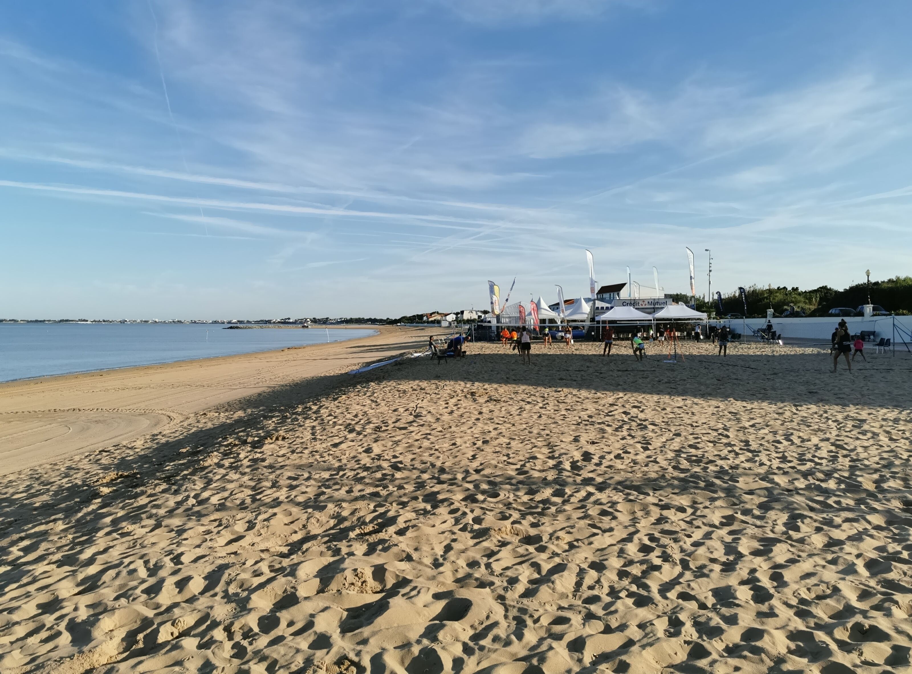 Belle plage de 2km sur 50m de sable fin, fond plat de sable (fond vaseux en marée basse). Plusieurs points douche tout au long de la plage. Seul gros bémol, plage sans vague..