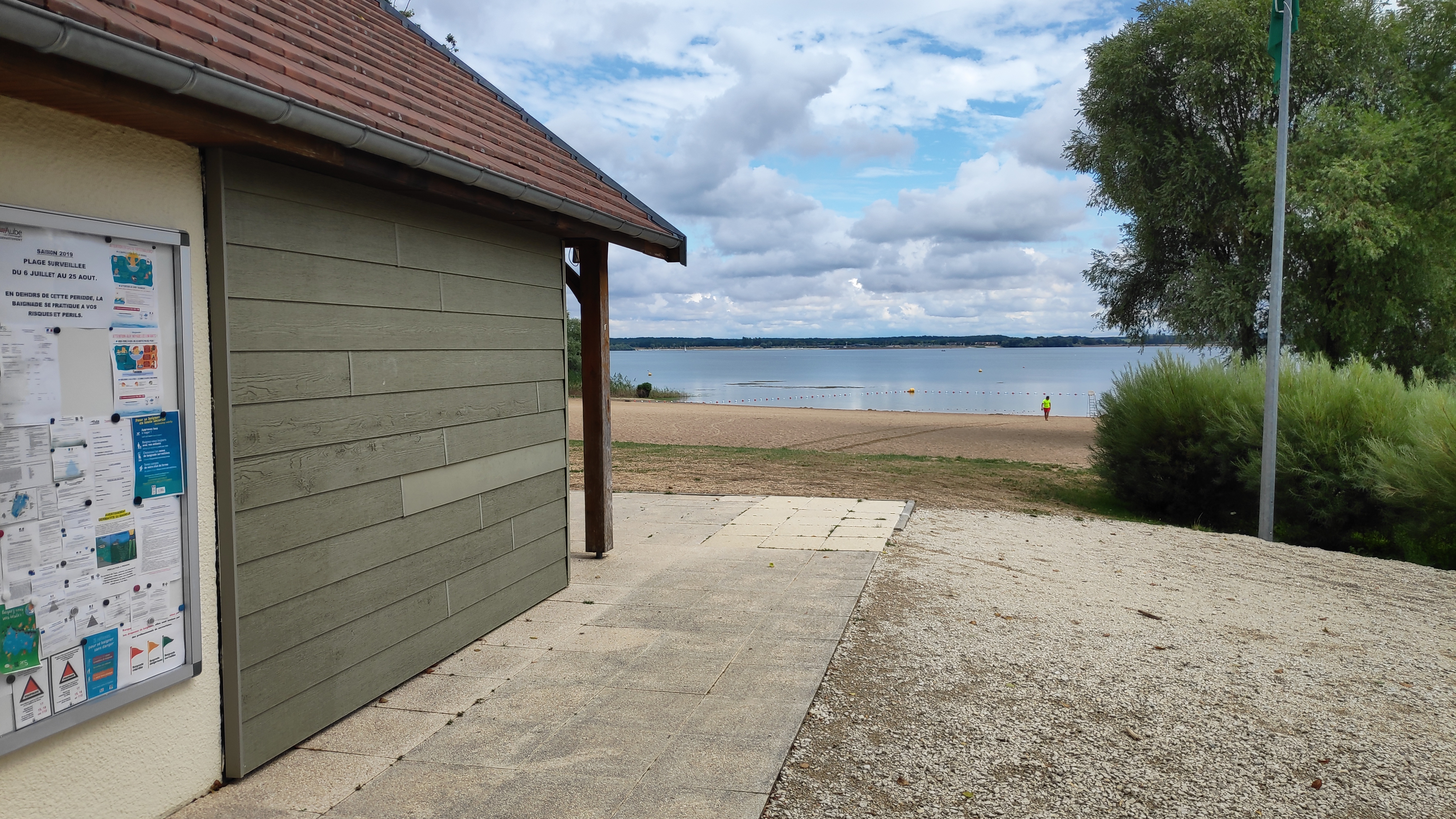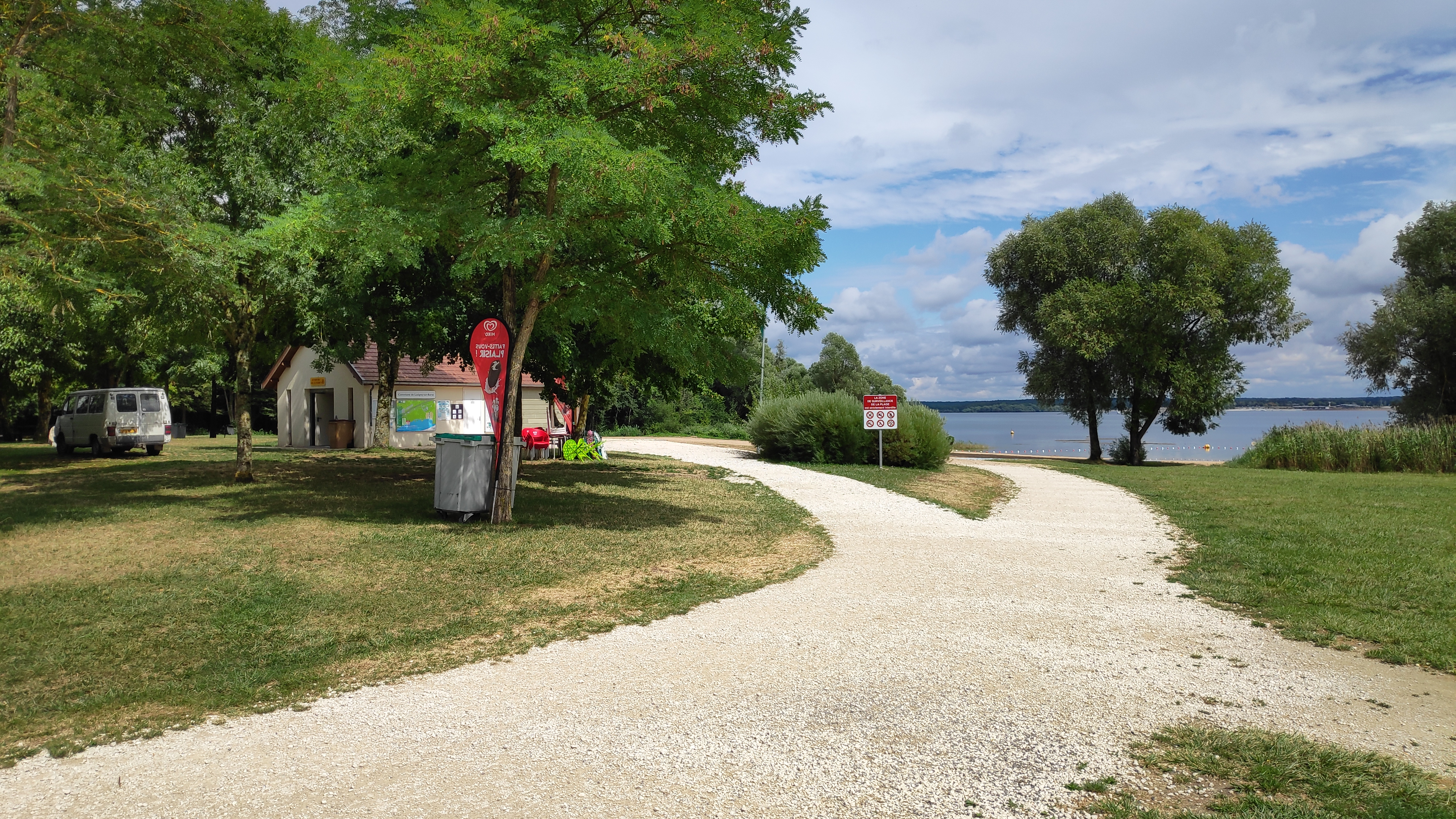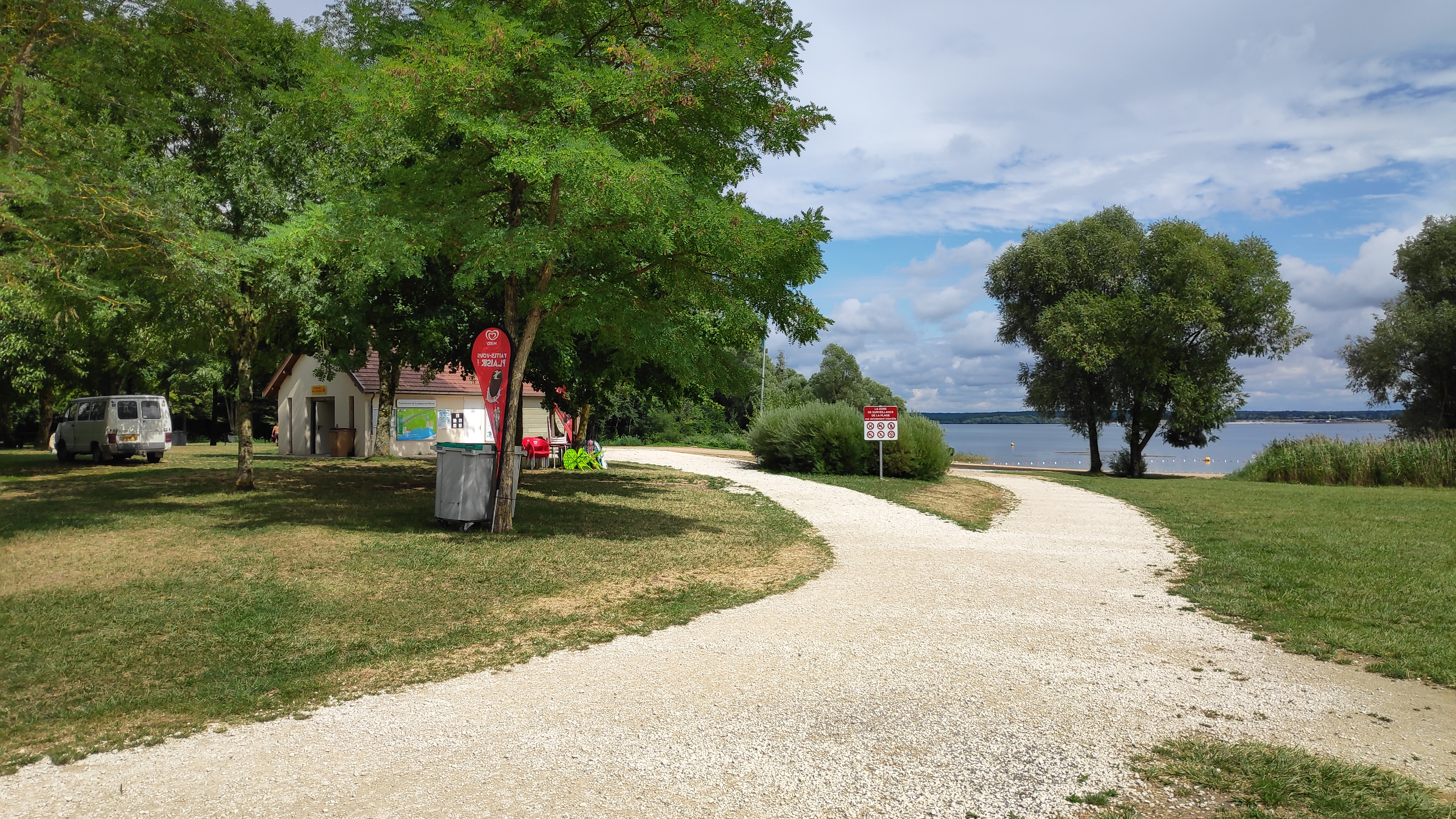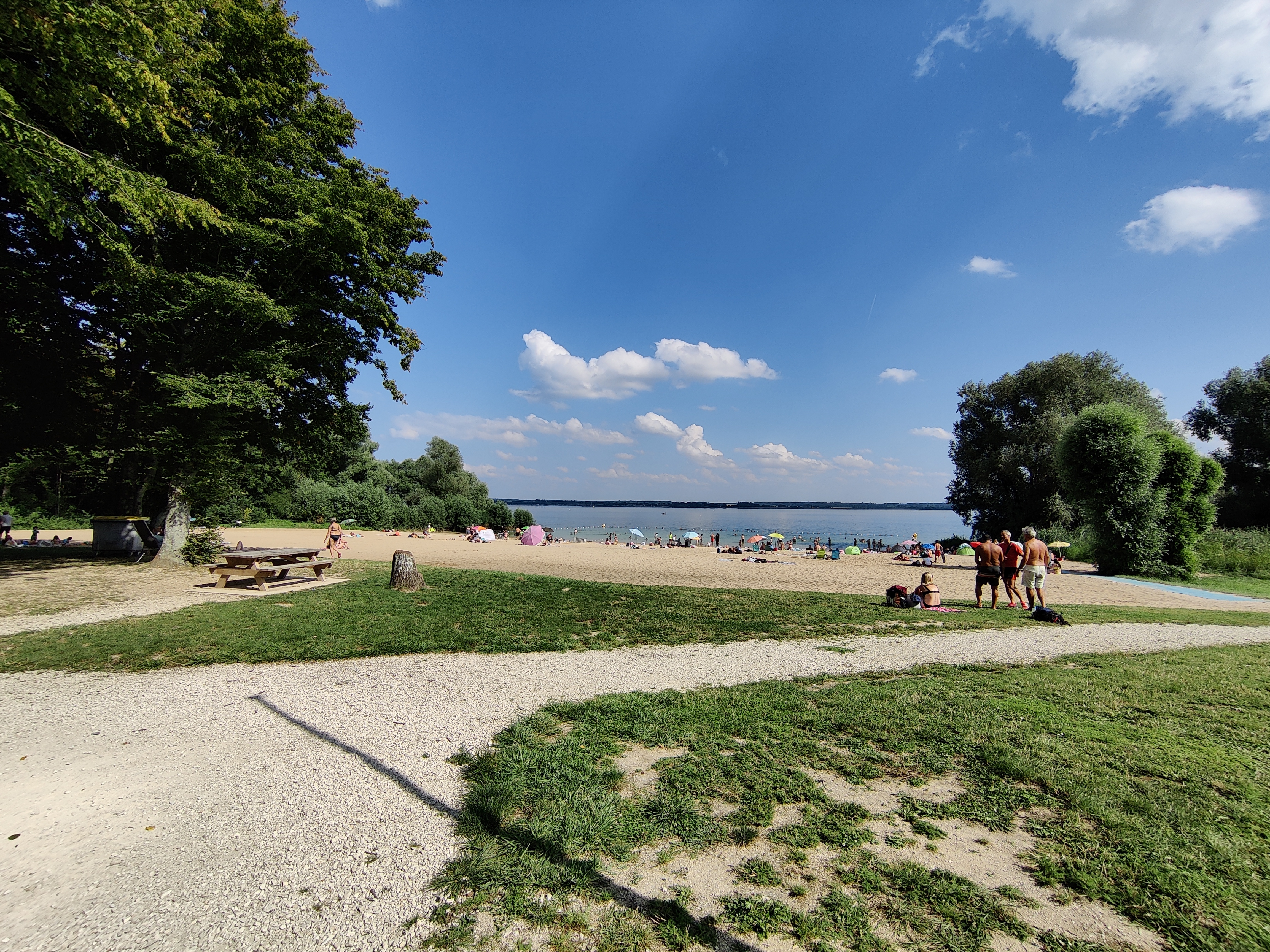 Petit plage sur un lac avec un grand parking. Il y a de quoi se restaurer sur place ou coin pique nique avec tables et banc.