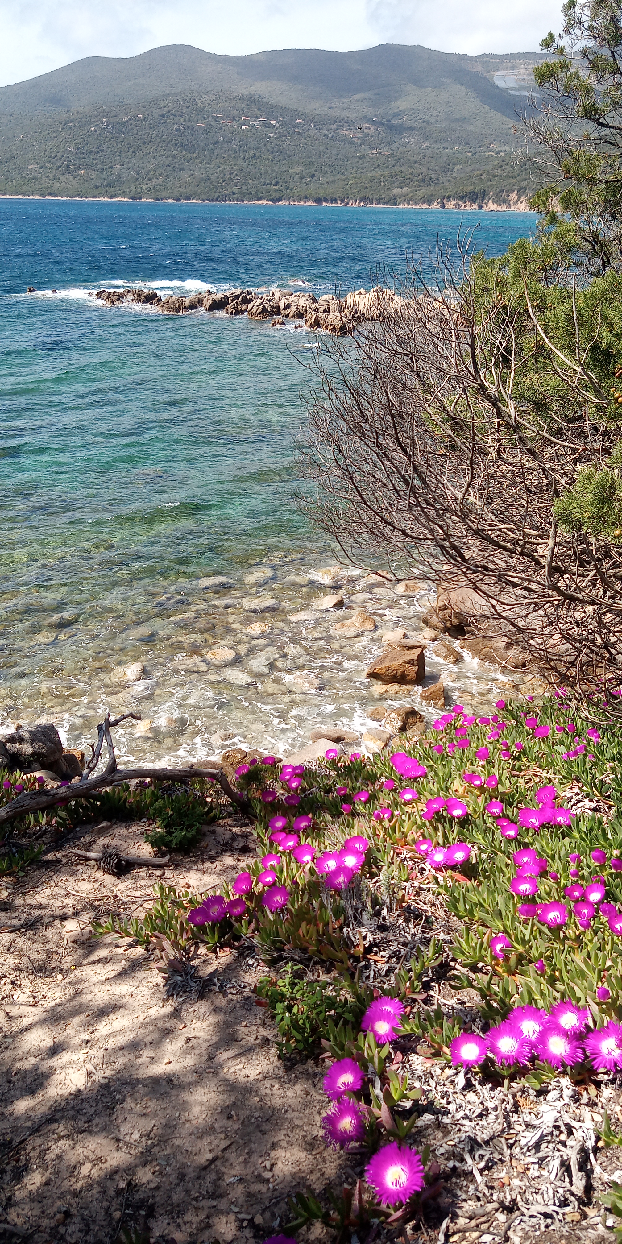 Belle plage un peu sauvage, chemin de randonnée jusqu'à la tour génoise. Beaucoup de fleurs sur le chemin et près de la plage (griffe de la sorcière)