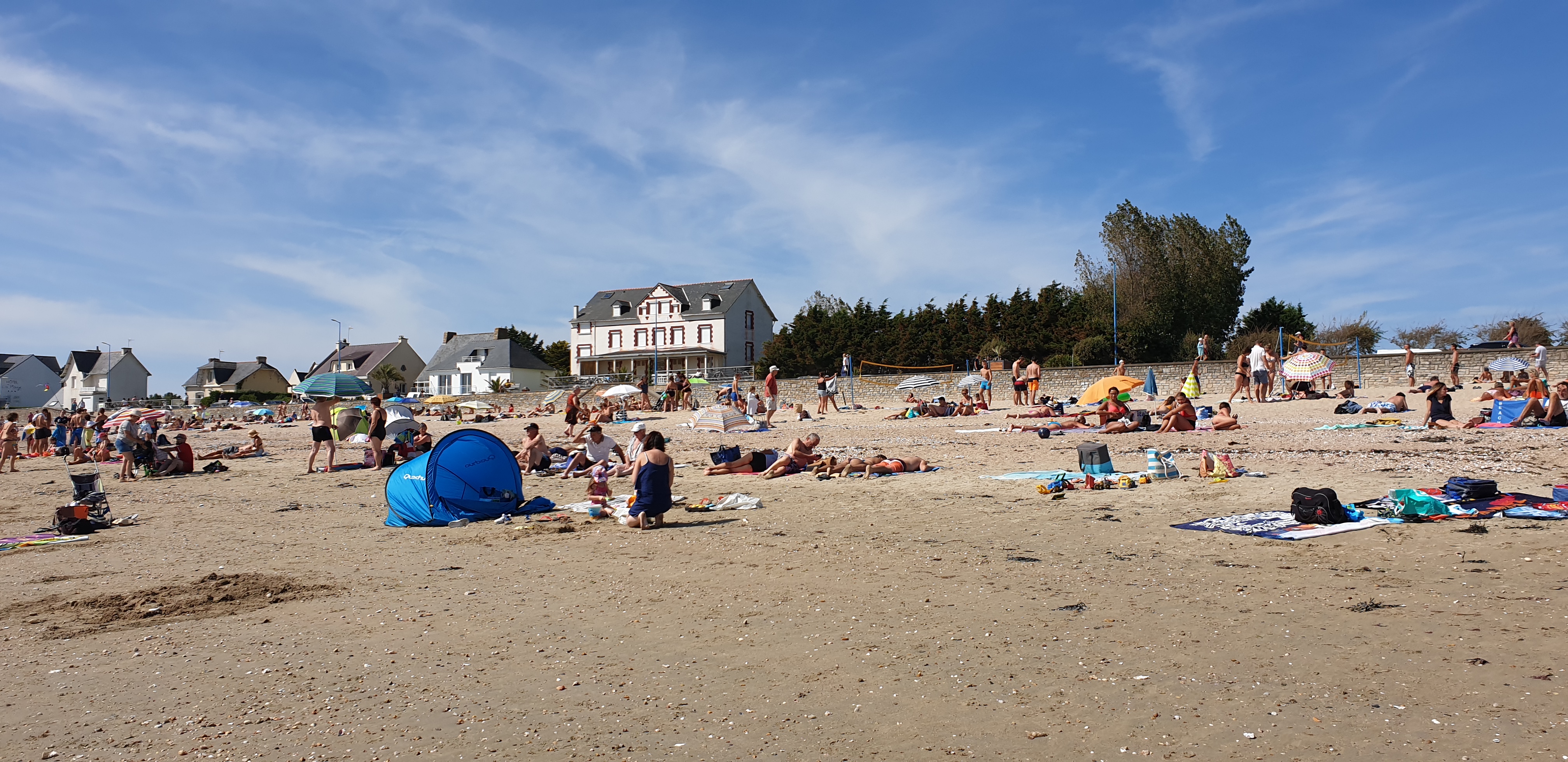 Une belle plage très agréable. Les abords sont animés : manège, square pour enfants, jeu de boules bretonnes (que nous avons découvert), petanque, glacier .... même au mois de septembre.